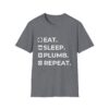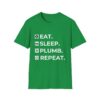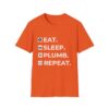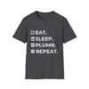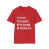 The Eat. Sleep. Plumb. Repeat. T-Shirt is available in a variety of colours including Black, Orange, Green, Blue, Purple and Red.
